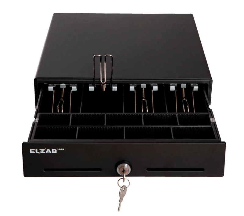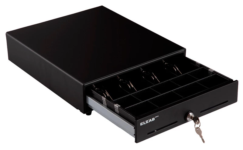 Solidna szuflada w metalowej obudowie. Wyposażona w przewód łączący z kasą o długości 1,4 m zakończony złączem DC 2.1/5.5 oraz zamek trójpozycyjny (otwarcie szuflady kluczem, otwieranie elektromagnesem, zablokowanie kluczem). Szuflada aktywna.