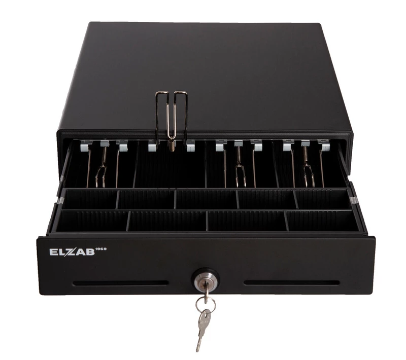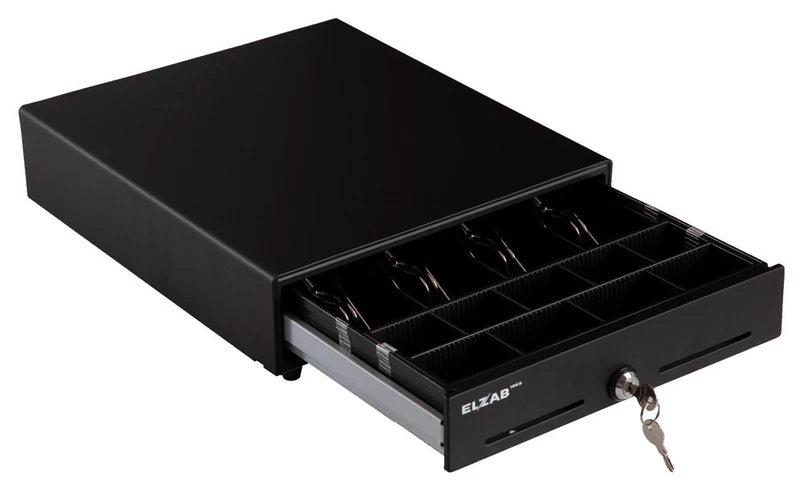 Solidna szuflada w metalowej obudowie. Wyposażona w gniazdo RJ służące do podłączenia kabla szuflady. Przewód łączący z kasą zakończony złączem RJ jest na wyposażeniu szuflady. Trójpozycyjny zamek (otwarcie szuflady kluczem, otwieranie elektromagnesem, zablokowanie kluczem).